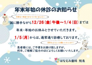 当院は12/26(金)午後~1/4(日)まで休診となっております。1/5(月)より通常診療開始となりますので、よろしくお願いいたします。